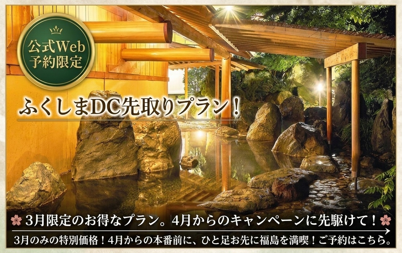 キャンペーン期間中(4月〜6月)は混雑が予想されますが、3月なら落ち着いた空間でゆったりと温泉や食をお楽しみいただけます。福島の春を先取りするお得な旅に、ぜひお出かけください。